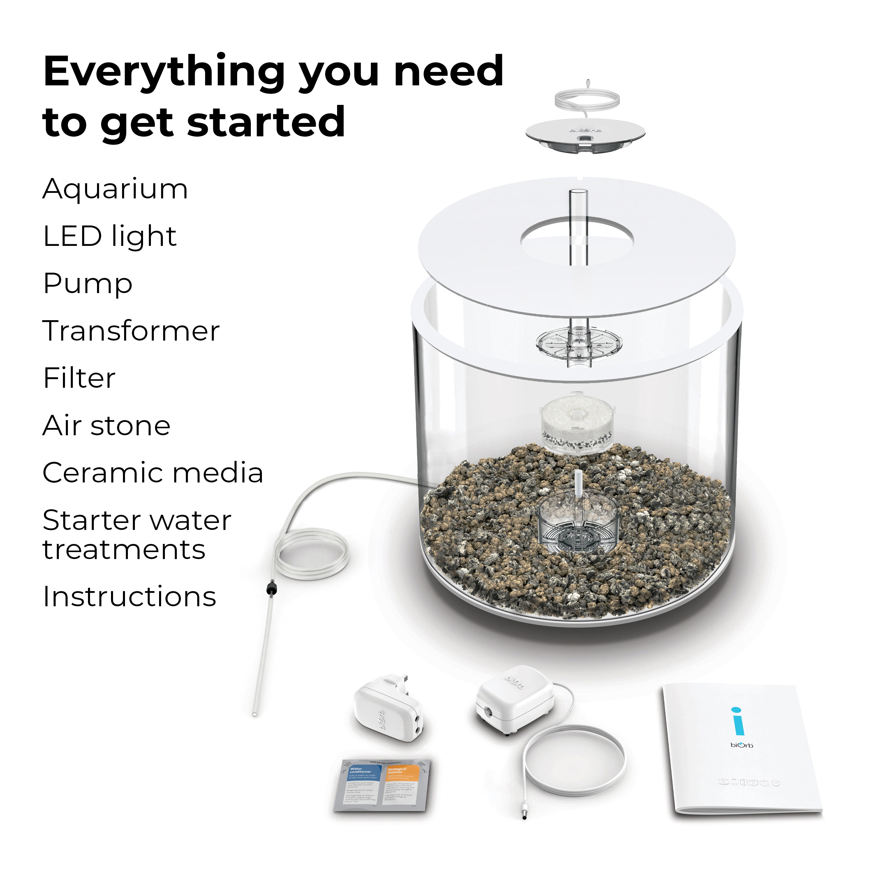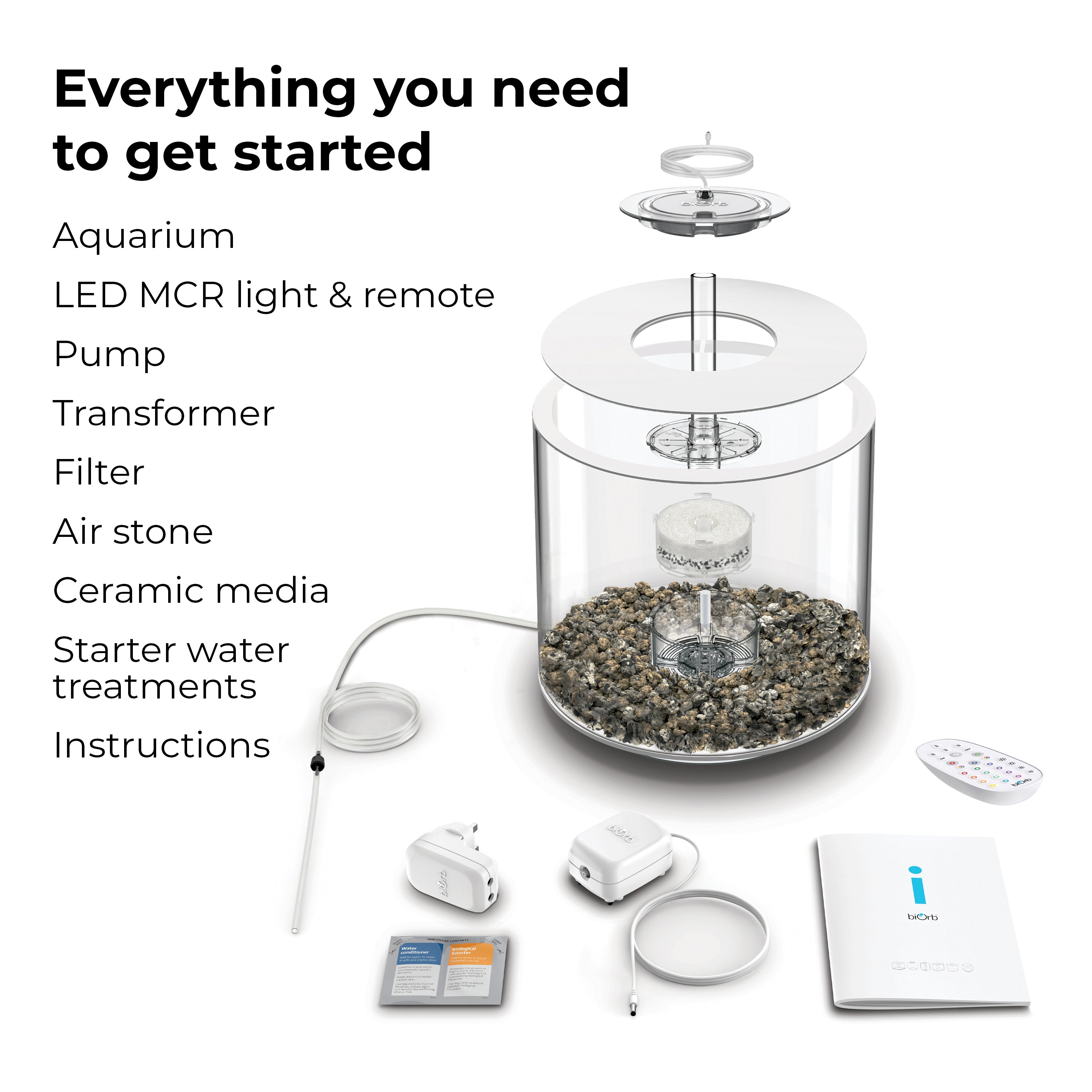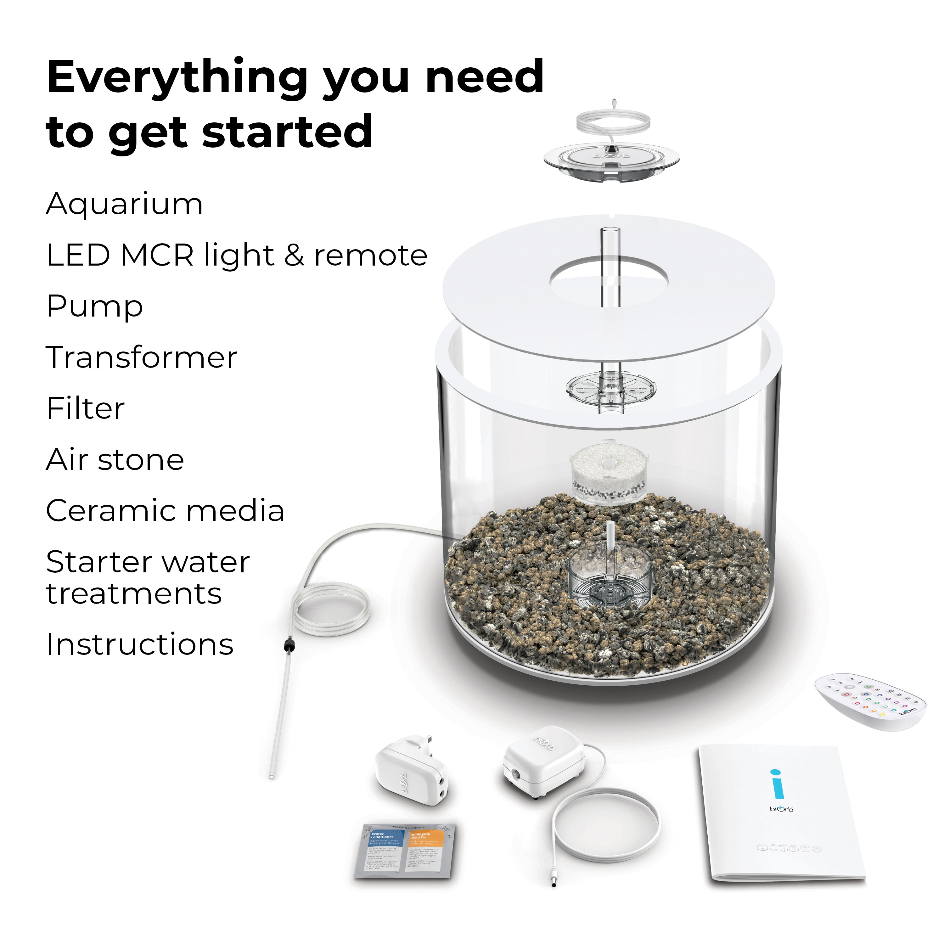 - EVERYTHING YOU NEED TO GET STARTED, JUST ADD DECOR — Includes a 8-gallon (30 L) acrylic aquarium, white LED lighting, a new quiet air pump, a low-voltage 12V transformer, filter, air stone, ceramic media, starter water treatments, and instructions. Just add decorations! Also includes a 2-year warranty.