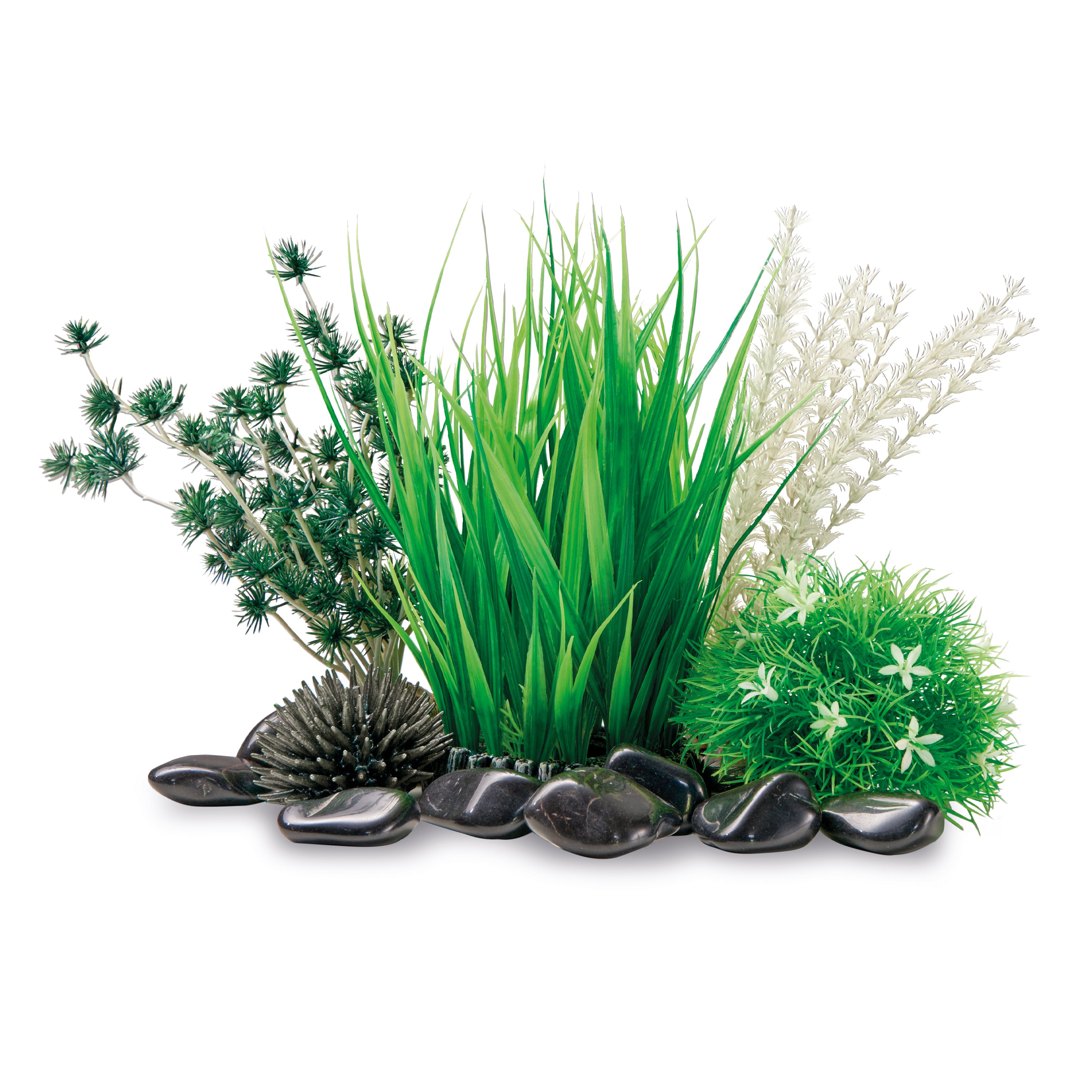 Grass Ring Sculpture, Black Bonsai Ball, Flower Ball with Daisies, one Small Ambulia Plant, one Black Sea Urchin, and a Black Marble Pebble Set