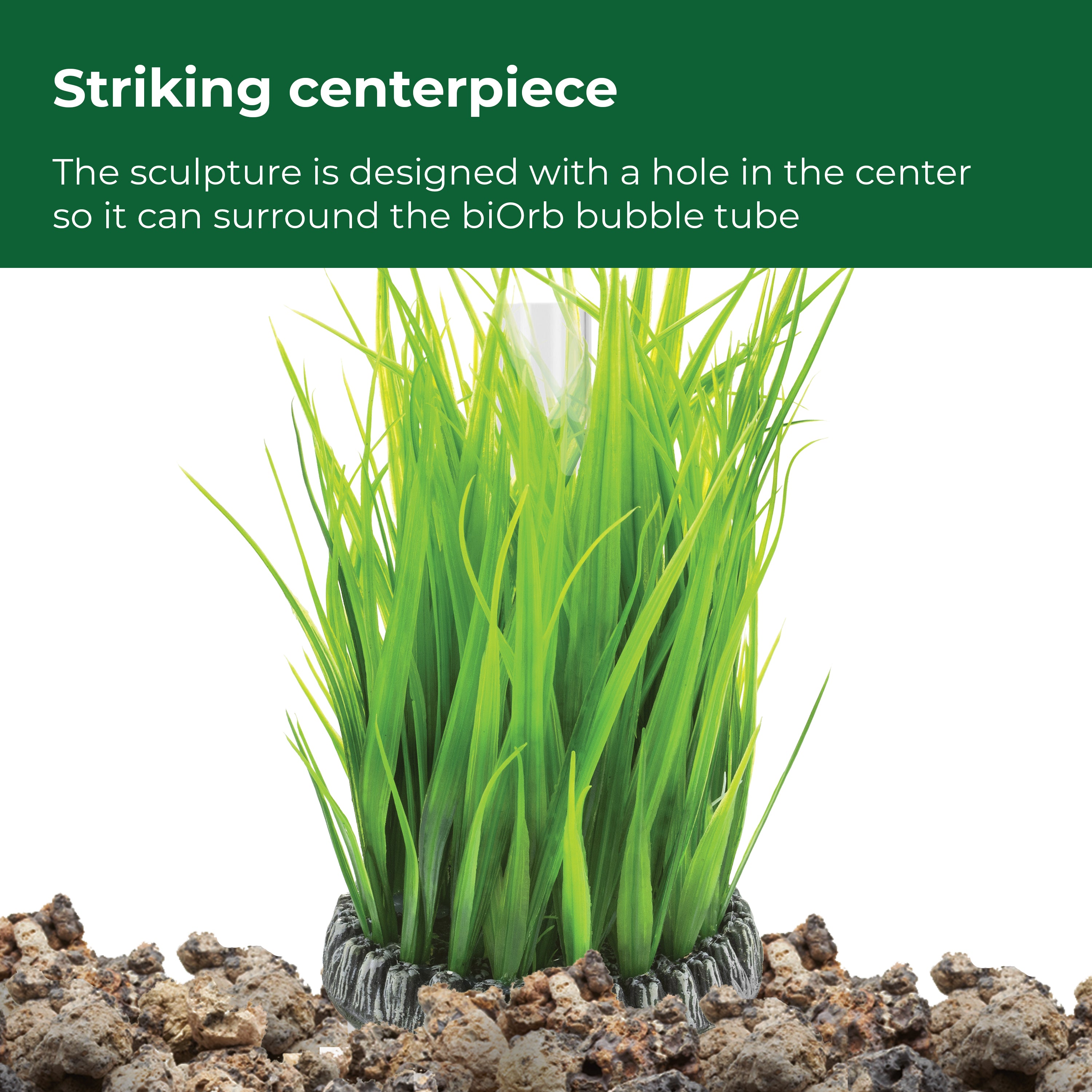 • THOUGHTFULLY DESIGNED COMPONENTS — The centerpiece of this set is a ceramic-resin blended base and plastic plant top sculpture that effortlessly slides over the biOrb bubble tube. The fish-friendly plants are designed with smooth weighted ball bases that seamlessly blend in with the biOrb ceramic media. Additionally, an intricately detailed natural starfish replica and black marble pebbles add pops of color to the bottom of the aquarium.
