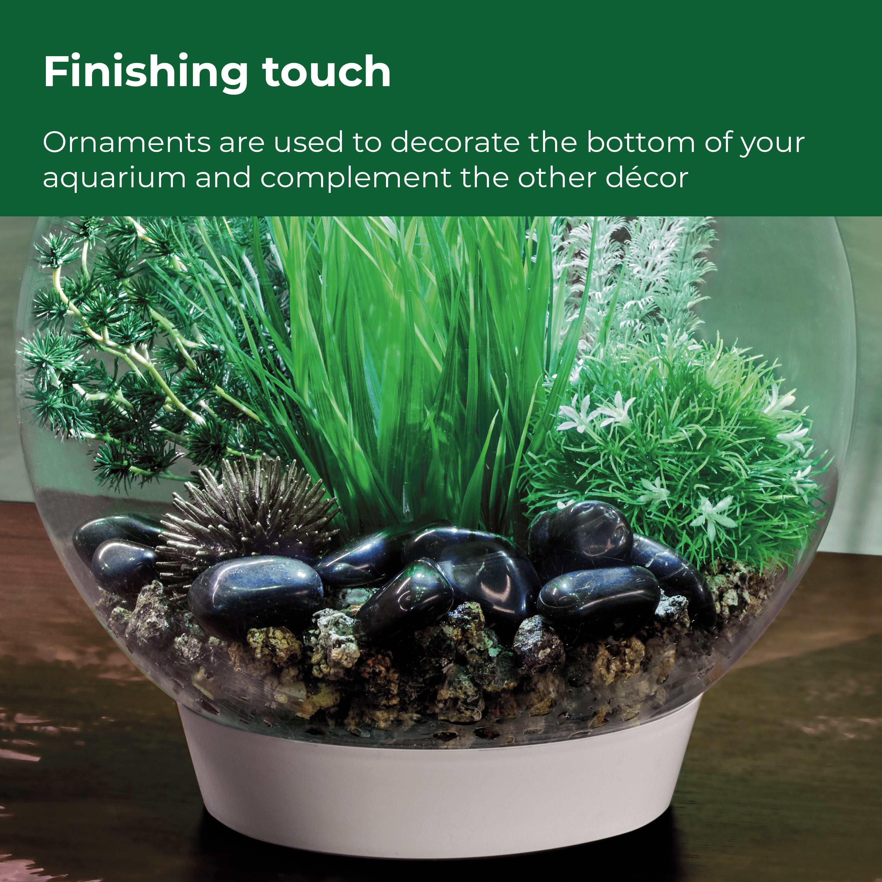 • DECORATE YOUR AQUARIUM IN A SNAP! biOrb Décor Sets are a themed collection of some of our favorite pieces, curated for your aquarium. This set features a Grass Ring Sculpture, Black Bonsai Ball, Flower Ball with Daisies, one Small Ambulia Plant, one Black Sea Urchin, and a Black Marble Pebble Set. Each perfectly complements the others.